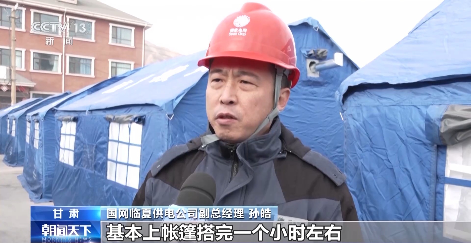 国网临夏供电公司副总经理 孙皓:基本上帐篷搭完一个小时左右,我们就能把电通上,因为每个点我们都有3到10名工作人员在跟进,充分地调动了我们所有的人员和力量,把这项工作放在最重要的位置上,把老百姓的电先供好。
