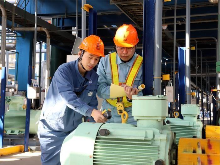 齐鲁石化员工巡检监测运转电机温度,确保设备安稳运行。中新社发 刘芳芳 摄