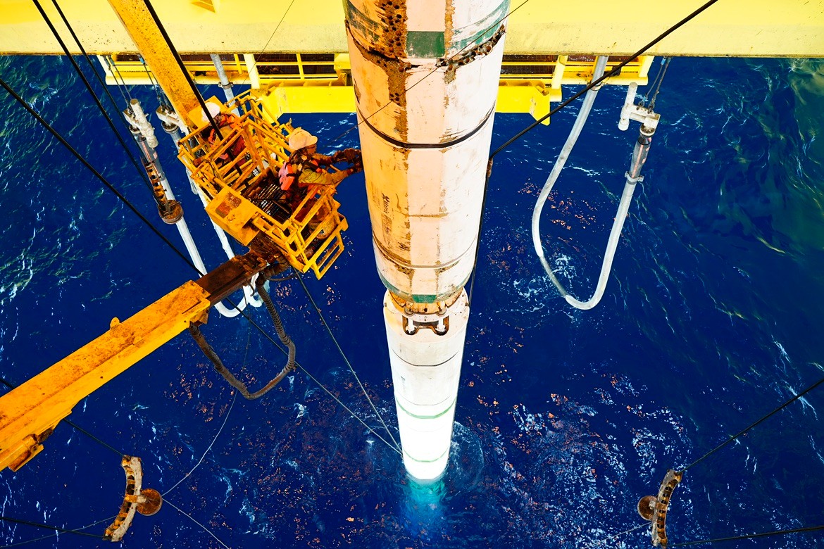 现场作业人员将深水钻井管柱送入海底 李建禄/摄