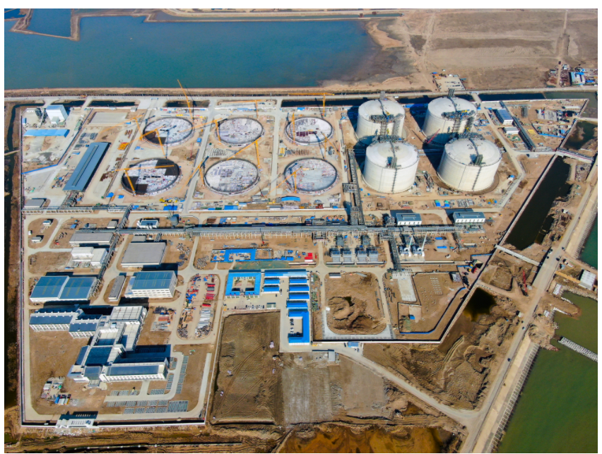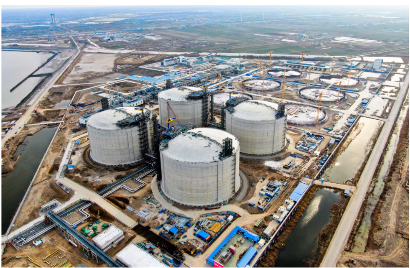 中国海油盐城“绿能港”即江苏滨海液化天然气接收站项目,是国家天然气产供储销体系建设及互联互通重点规划项目。一期工程建造10座大型液化天然气储罐,包括2019年5月先建的4座22万立方米储罐和2021年6月扩建的6座27万立方米储罐。一期工程计划于2023年底全部投产运行,液化天然气年处理能力达600万吨。
