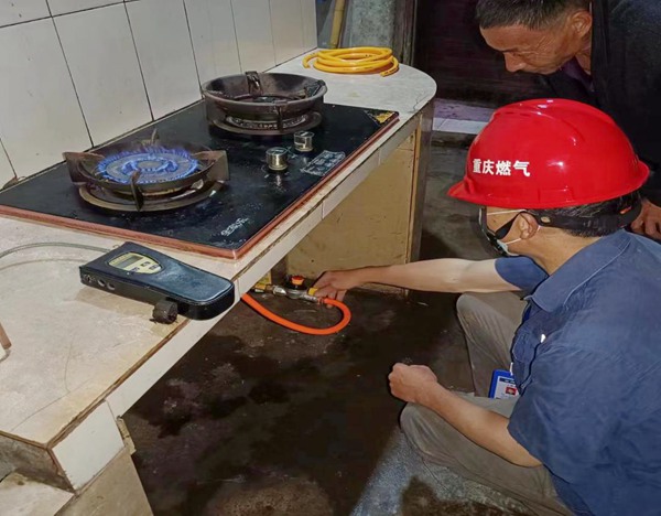 工作人员为塘河镇硐寨村4组村民刘顺财通气。重庆燃气集团供图