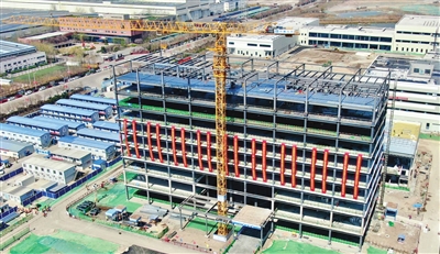 昨天,新能源汽车检验中心(天津)二标段主体封顶,图为建设项目施工现场。