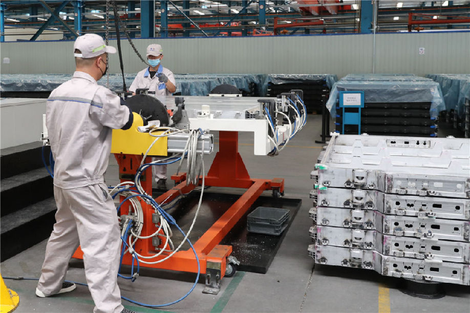 辽源市汽车改装公司正在安装生产新能源汽车铝电池包动力总成壳体