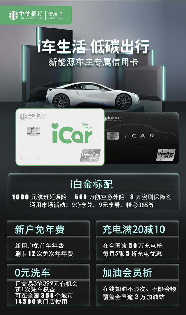在此背景下,中信银行围绕“绿色消费”的市场新趋势,根据新能源车主的充电、加油、养护等刚性需求,量身打造中信银行i车信用卡,不仅提供用车、养车的实在优惠,同时还围绕用户在商旅出行、生活消费的需求,提供贴心保障和丰厚权益,具体包括:航班延误2小时赔付可达1000元的航班延误险、最高500万保额的航空意外险、最高赔付30000元的盗刷保障险等保险保障,以及1元享机场、高铁贵宾厅服务,1元机场停车服务等出行类特惠权益,还可参加每周三、周六享5折券的精彩365、9元看大片、9分享兑等广受好评的中信银行信用卡品牌优惠活动。中信银行i车信用卡旨在为新能源车主提供覆盖生活方方面面的消费福利,着力构建一站式的新能源车主服务生态,为用户带来有价值、有温度的金融服务体验。