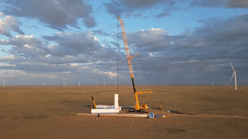 项目场址常年风沙大,给吊装作业带来了极大挑战,风机叶轮的吊装大多只能在夜间进行。参建人员积极克服恶劣的自然条件,自今年7月开始吊装首台风机以来,仅用4个月时间就完成了全部149台风机吊装任务,并实现项目当年开工、当年投产目标,以实际行动展现了“蒙能速度”。