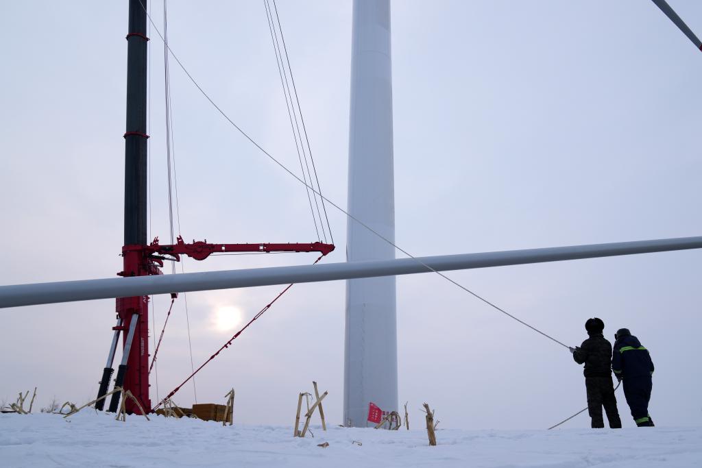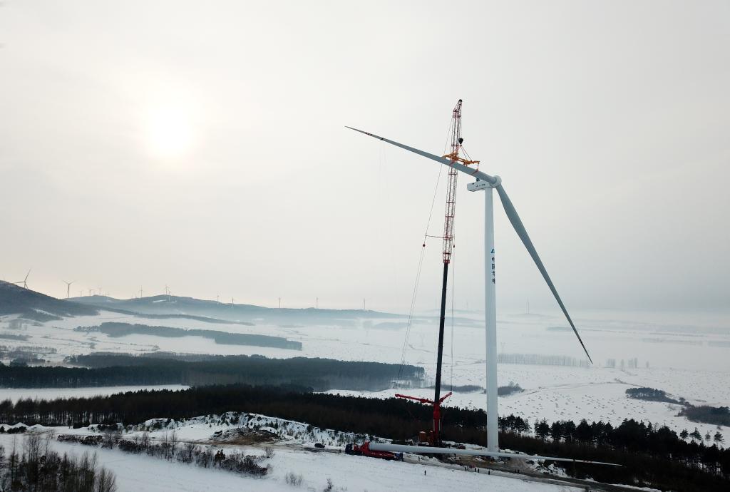 12月的黑龙江已是天寒地冻,但在黑龙江省哈尔滨市依兰县的鸡冠山上仍是一片热火朝天的忙碌景象。工人们正操控机械为风电机组完成吊装,远远望去,数百座白色风车有序排列,迎风挥舞,化风为电。